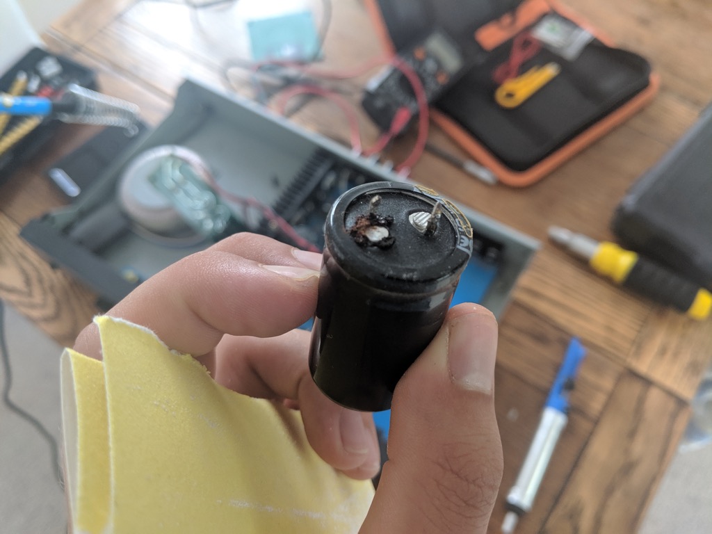 I opened up the case and the problem was immediately obvious. The large filtering capacitors wired across the power supply rectifiers were bulging badly (along with two other large capacitors in the signal path). I’m not sure exactly how old this amp is but it probably came out of the factory in the mid-90s so a recap is not unexpected.
